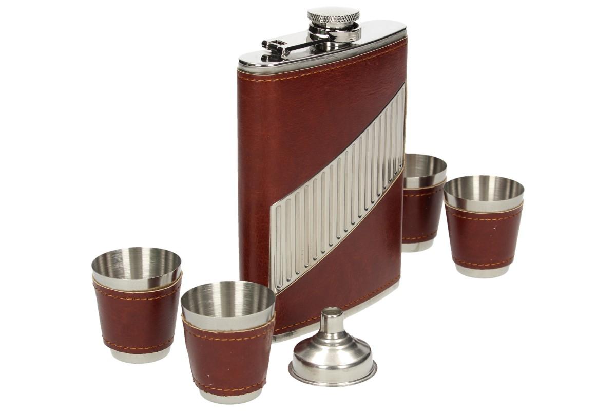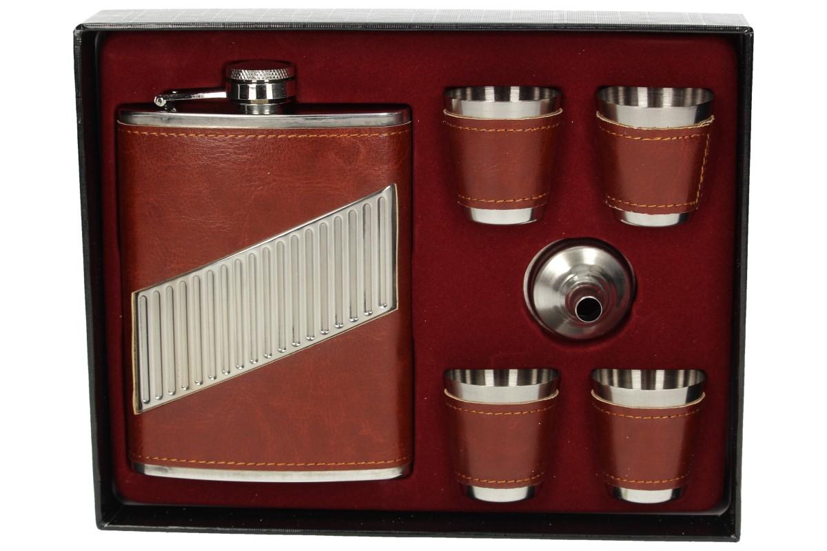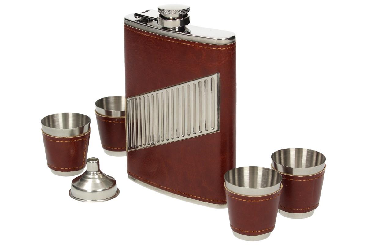 Dárková sada placatka v kožence s chromovanými pruhy, čtyřmi panáky a nákevkou je vyrobena z nerezového materiálu a je vhodná jako vkusný dárek.