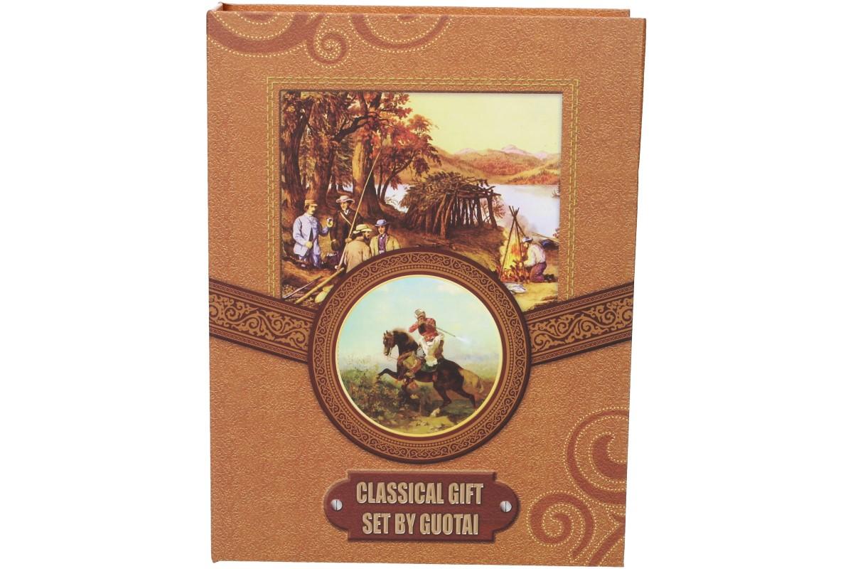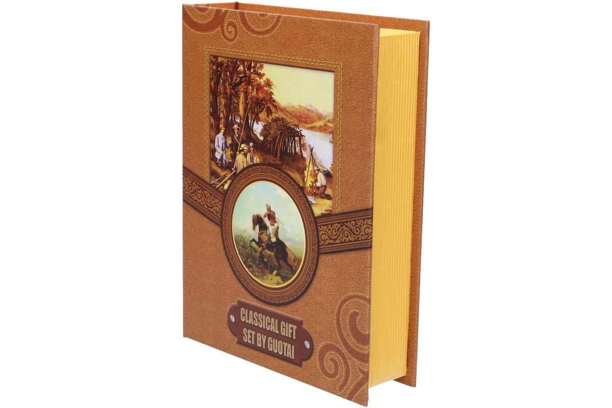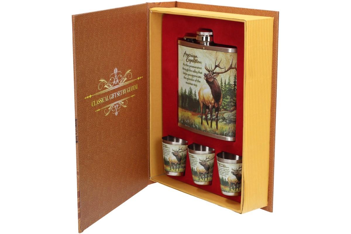 Dárková sada placatka s motivem jelena v líbivé designové krabičce ve stylu kniha, kterou můžete bezpečně uložit do knihovny a nikdo nepozná, že mezi knížkami máte ukrytý alkohol.