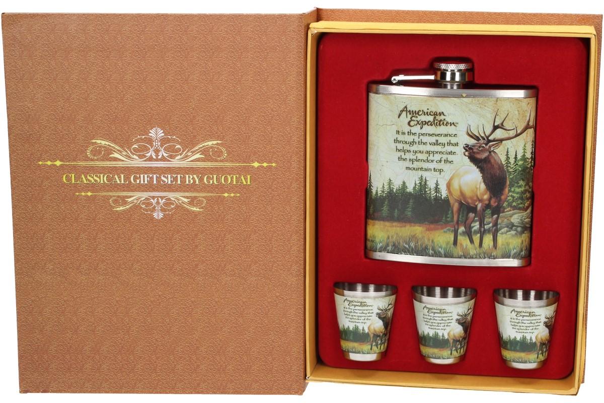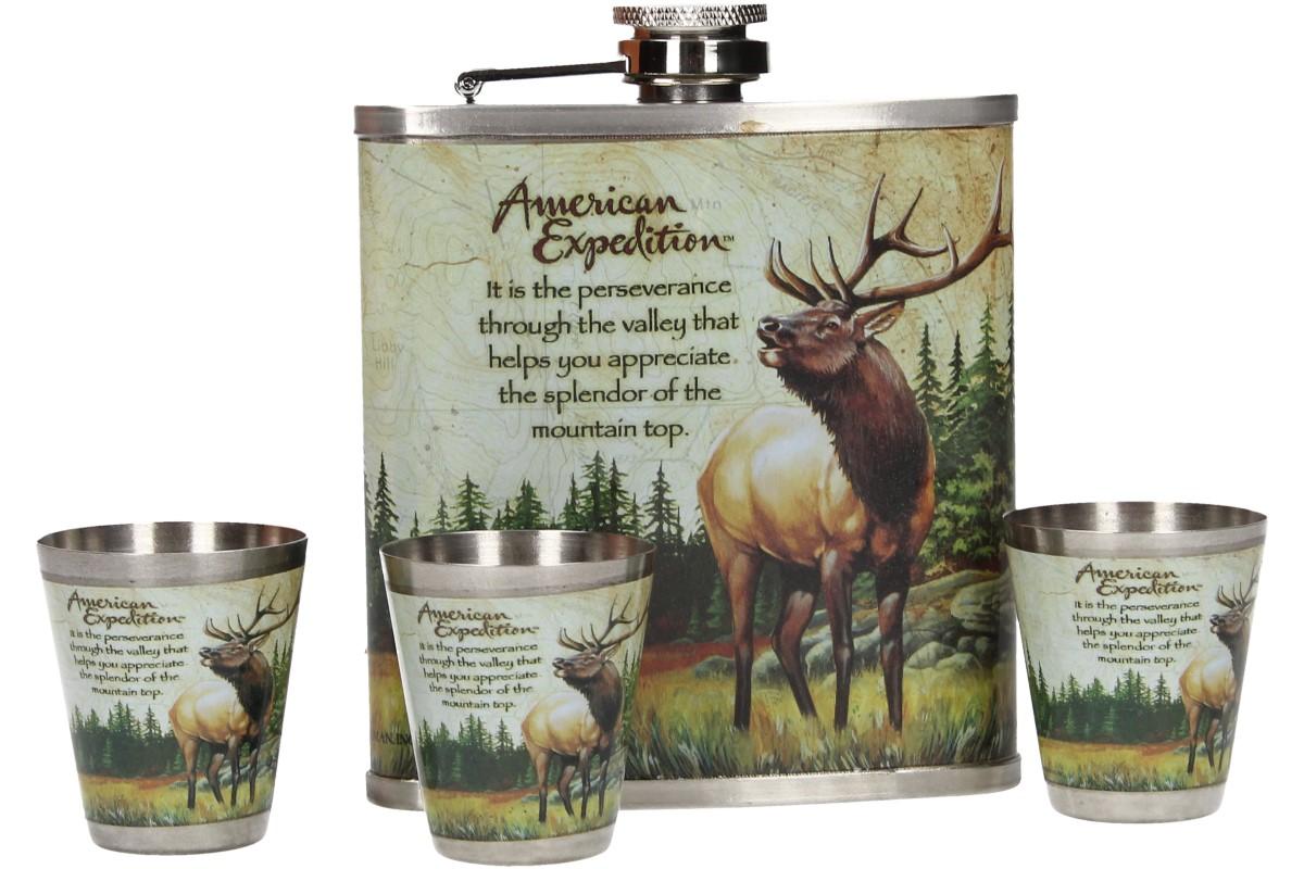 Dárková sada placatka s motivem jelena je vybavena třemi panáky a je vyrobena z kvalitního nerezového materiálu Dárková sada placatka jelen: je vhodná nejen jako vkusný dárek pro myslivce, hajné ale pro všechny ty, kdo rád chodí do lesa nebo pije alkohol v knihovně :-)