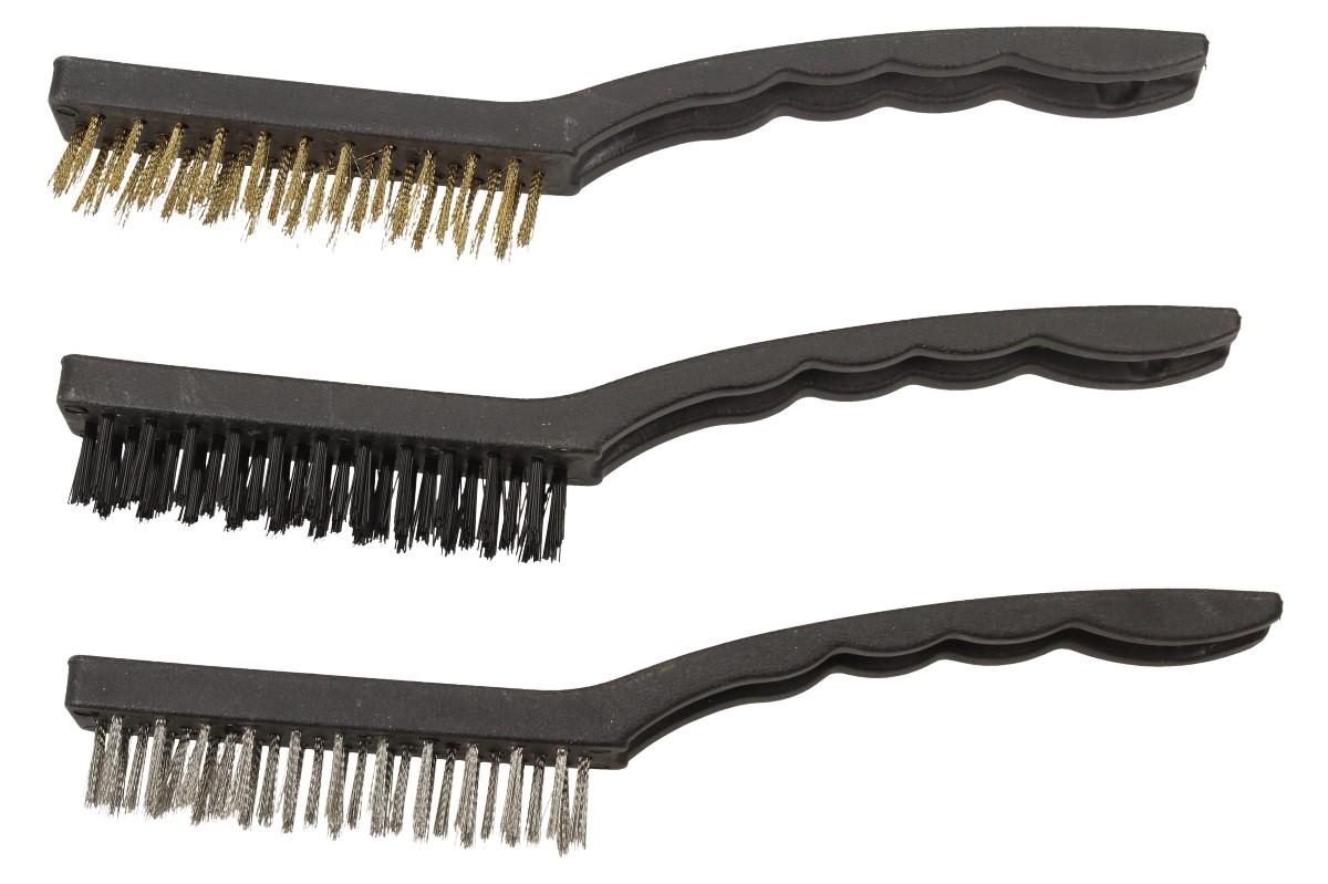 Kovový kartáček sada 3 kusy Velký jsou naprosto super, když potřebujete odstranit hrubé nečistoty a nánosy z menší plochy. Kovové kartáčky mají 3 druhy různých tvrdostí štětinek. Stříbrný nerezový, zlatý mosazný a černý měkkčí kartáček, všechny je využijete k citlivějšímu vyčištění především menších a těžce dostupných ploch. Budete tak mít víc pod kontrolou úbytek materiálu z čištěného předmětu a také mnohem méně naprášíte.