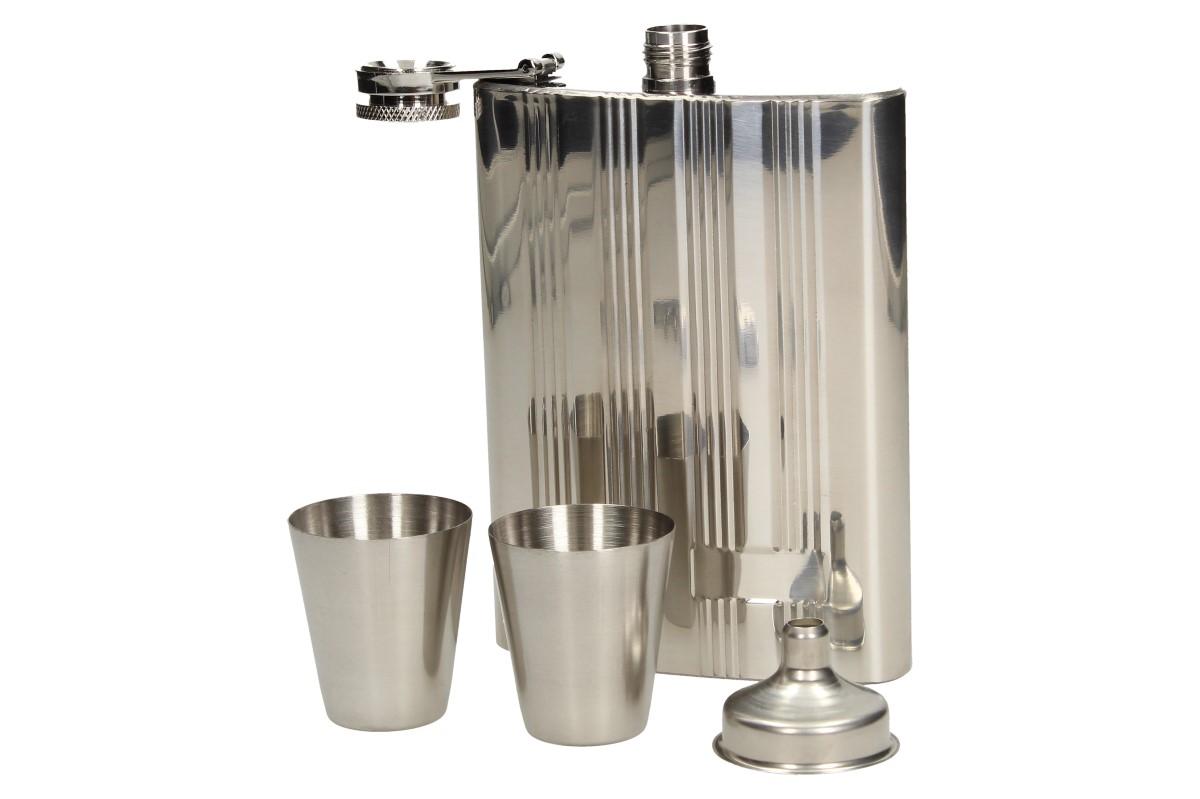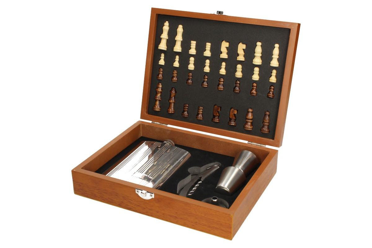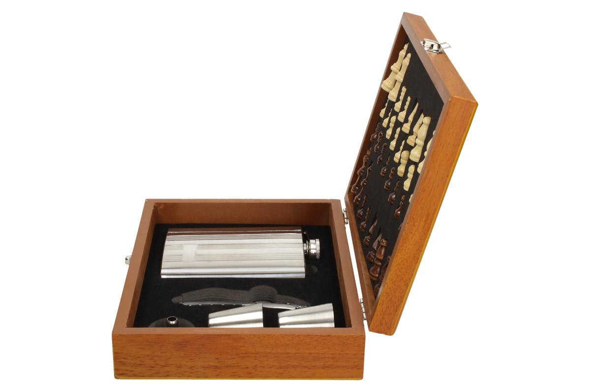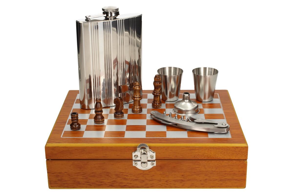- Obsahuje: placatku, 2 x panák, otvírák s vívrtkou a malým nožem, nálevka, šachy a hrací deska v provedení kufříku
