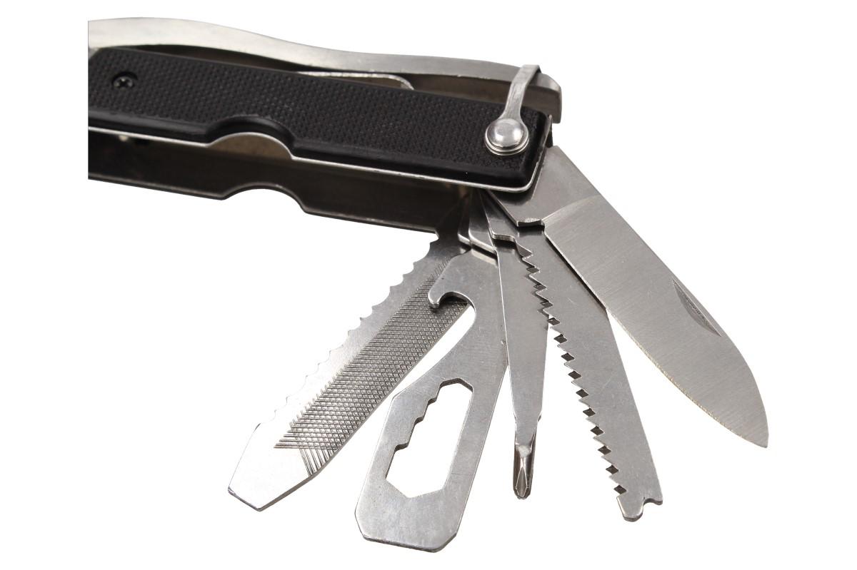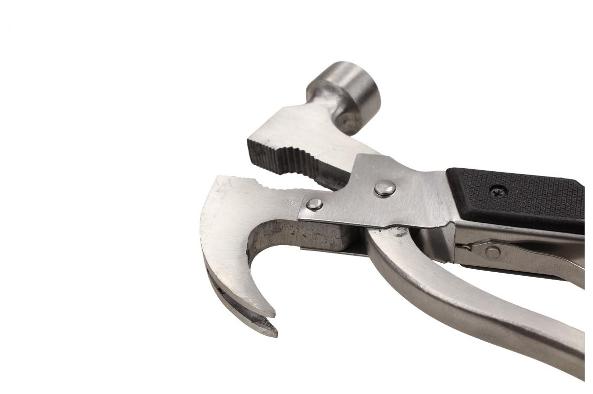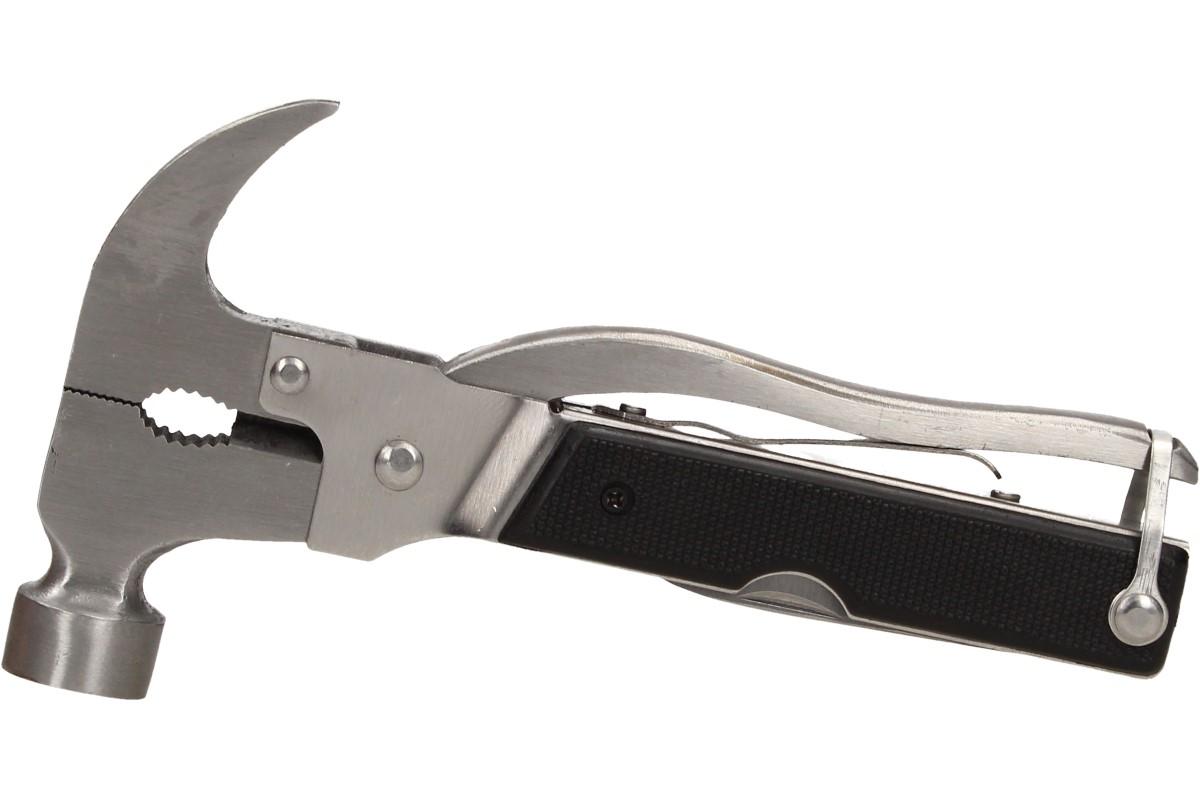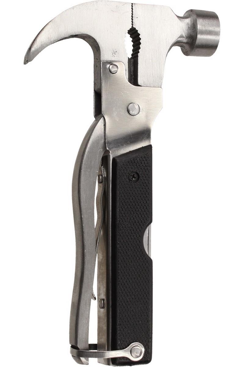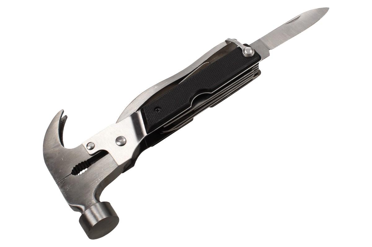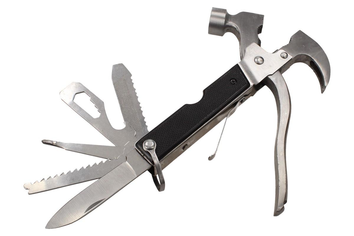 Multifunkční kladívko 18 v jednom - ocel. Povinnost pro každého dobrodruha, trempa, houbaře. Ideální i jako nouzová výbava do vašeho auta. Kladívko je zároveň i multifunkční Švýcarský nůž, tak jak ho všichni už dobře známe.Hodí se ke každé příležitosti, pokud si ho zabalíte cestou pod stan do batohu, nebudete muset zatloukat kolíky dřevem. Díky své kompaktní velikosti a přiměřené váze to není žádná přítěž. Pohodlný úchop díky plastové protiskluzové rukojeti. Obsahuje: kladivo, kleště, štípací kleště, odstraňovač hřebíků, samozřejmě nůž, 3 druhy šroubováků, 2druhy pilky, 4 typy klíčů,pilník, páčidlo, otvírák apod.