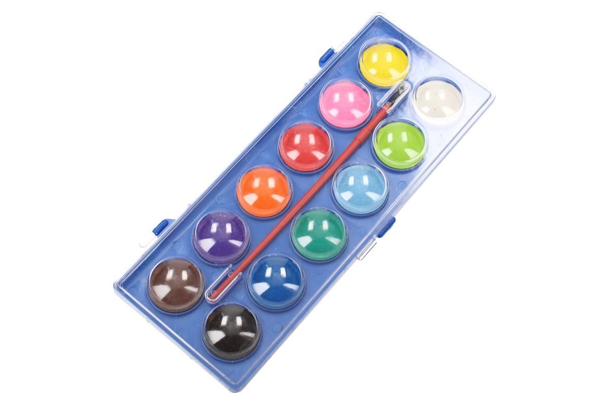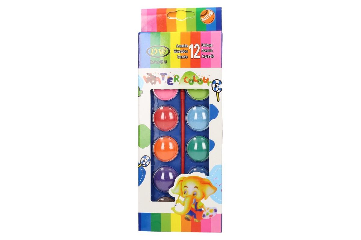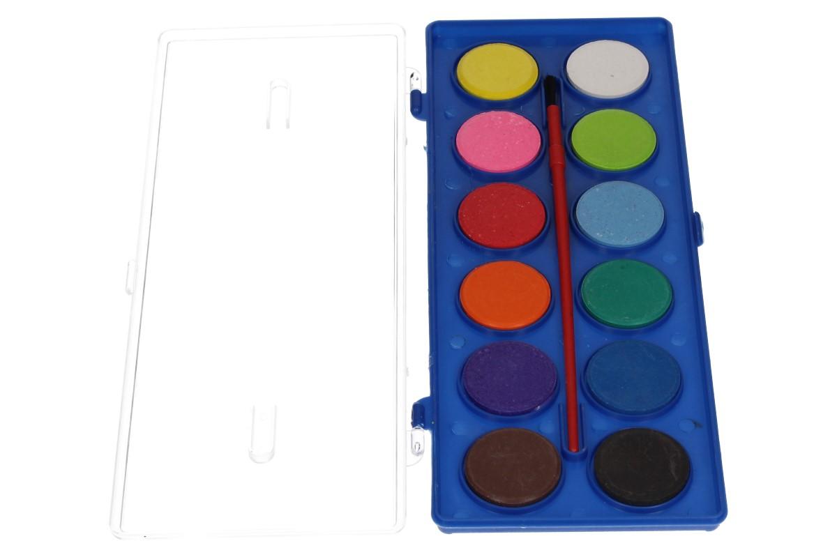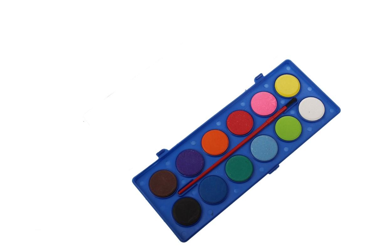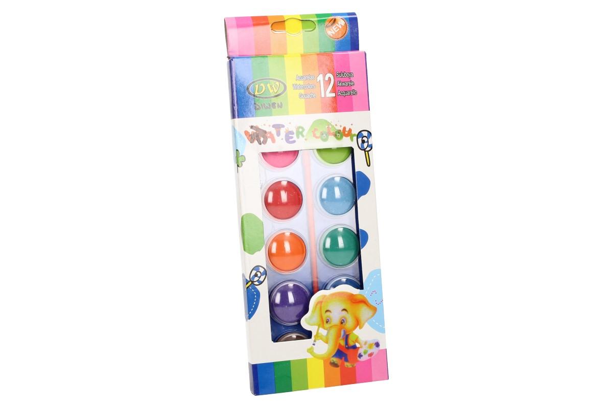 Vodové barvy 12 barev se štětcem a průměrem barvy 30mm. Probuďte kreativní stránku vašich dětí! Kvalitní vodové neprůhledné barvy s velmi dobrou smáčivostí. Rozpustné v malém množství barvy. Vodovky jsou balené v plastové kazetě s prohlubněmi pro míchání.