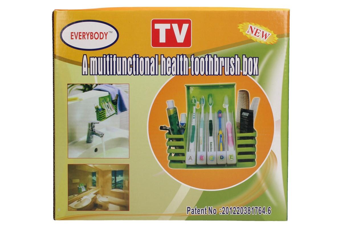 Jedná se o multifunkční úložný stojan na zubní kartáčky vyrobený z vysoce kvalitního plastu šetrného k životnímu prostředí, který je hygienický a bezpečný díky novému designu. Dokáže účinně udržovat zubní kartáček, ale také koupelnové doplňky a kosmetiku. Během instalace nic nemusíte lepit ani vrtat, držák se připevňuje pomocí přísavek, které snadno a bezpečně připevníte na rovnou zeď a zrcadlo. Držák je opatřen dvěma většími košíčky do kterých můžete dávat hřebeny, sponky, zubní pastu, atd. a pěti vyklápěcími stojany na kartáčky. S tímto pomocníkem se už nebudou válet věci po celém umyvadle.