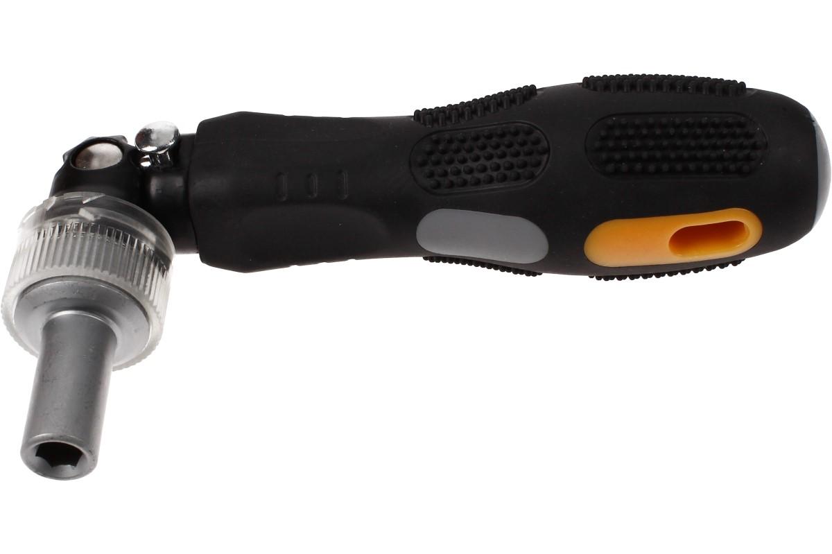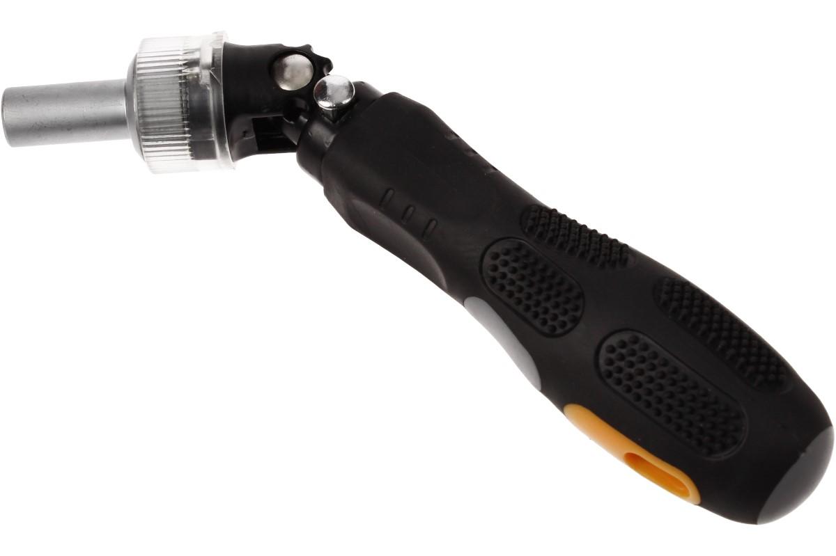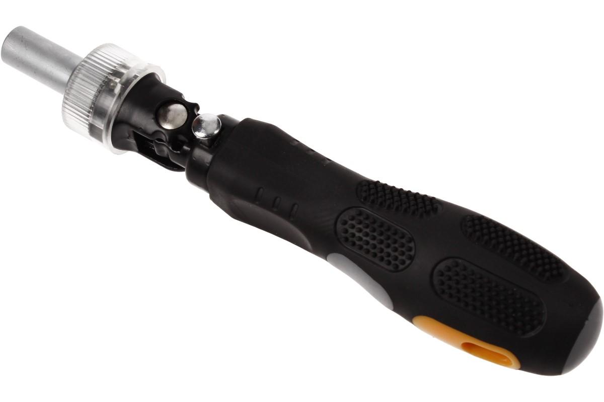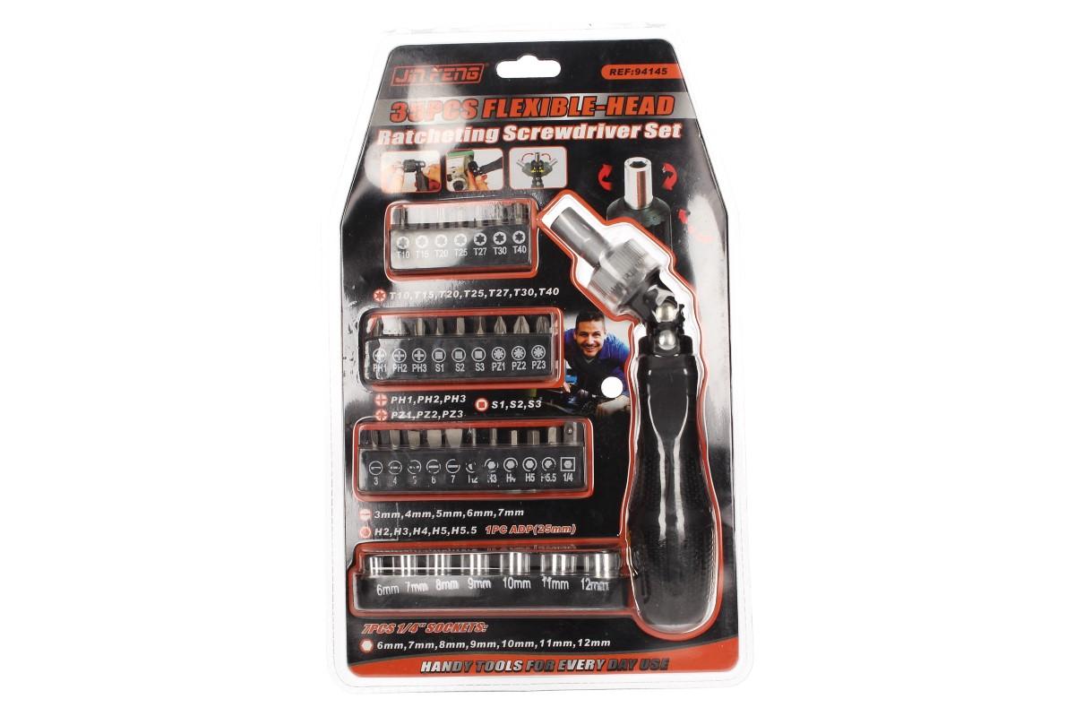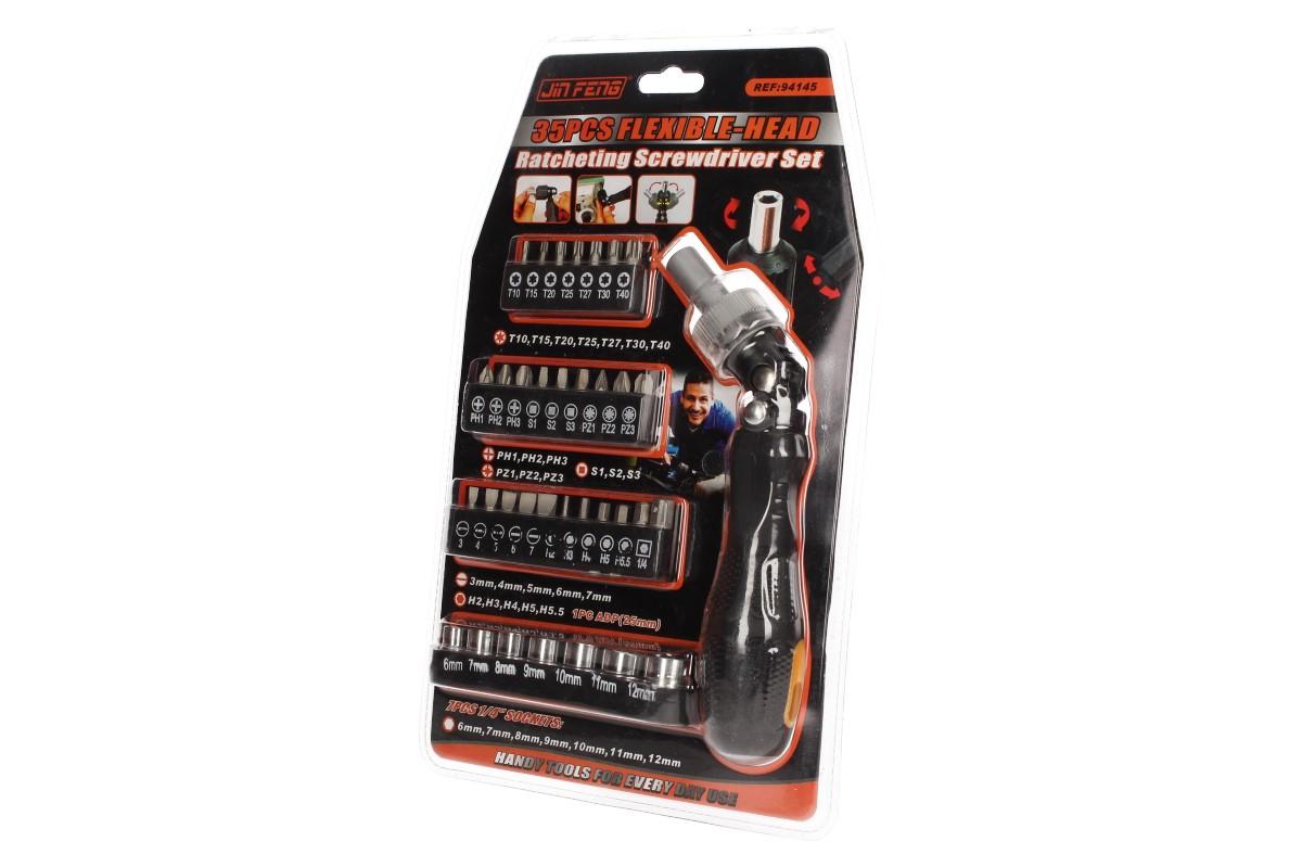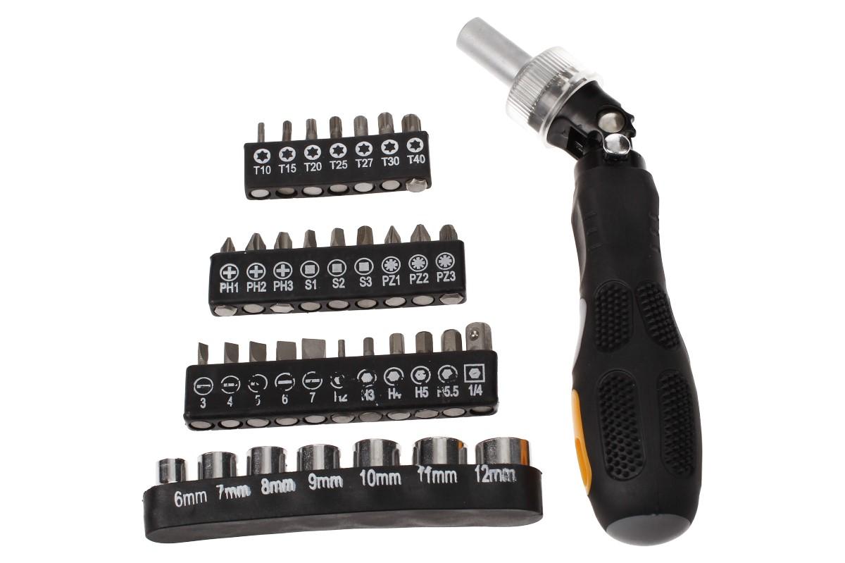 Multifunkční ráčnový šroubovák s 35 bity je perfektní multifunkční výbava do vaší dílny, do auta pro případ nouze, nebo na stavění nábytku pokud se nechcete zaobírat jednorázovými nástroji. Sada obsahuje šestihranné oříšky 6-12mm, hvezdičky t10-t40, imbus h2-h5.5, čtverce S1-S3, pět plochých bitů a šest křížových. Samotný šroubovák má kvalitně pogumovanou rukojeť, ráčnovou hlavu a nastavitelná sklon 90°. Bity dodávané v gumových pouzdrech.