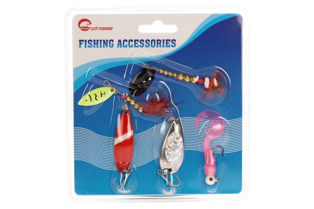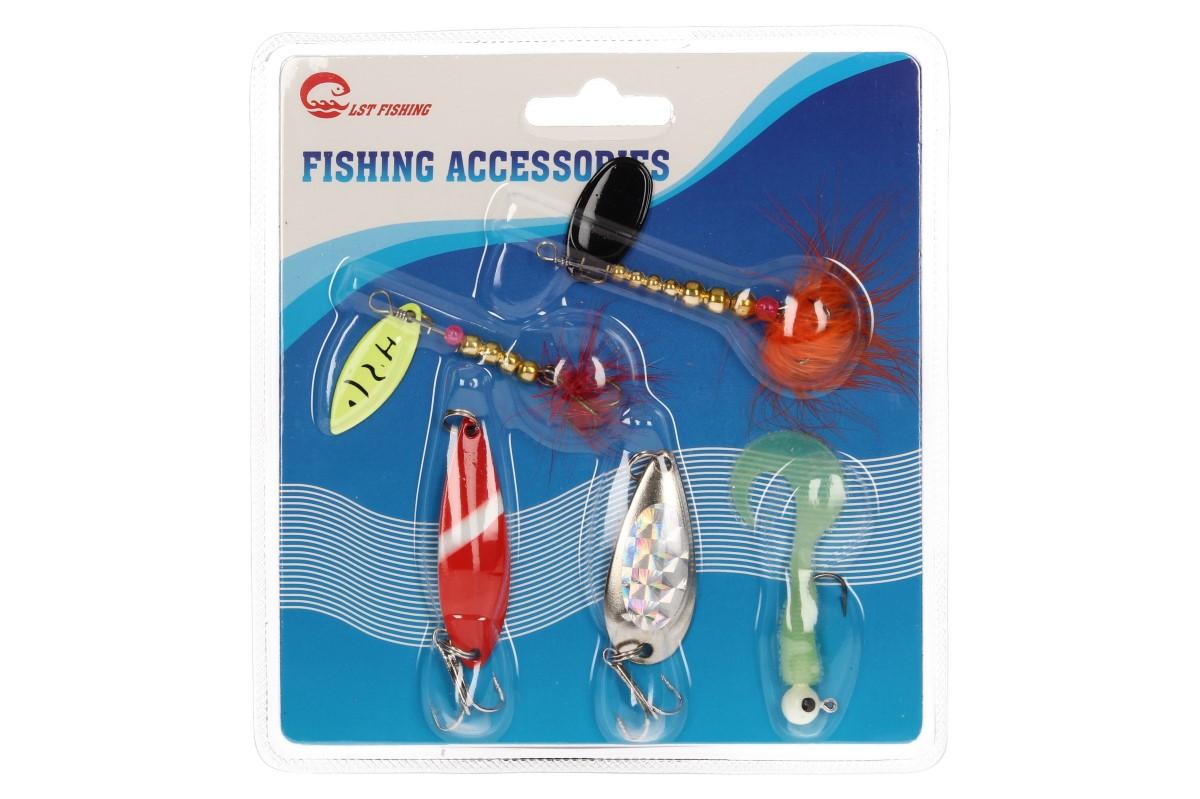 Set rybářských návnad v pěti různých barvách a tvarech, nesmí chybět žádnému, správně vybavenému rybáři. Každá návnada má na sobě přidělaný pevný trojháček, kromě gumové žížaly, která má háček pouze jeden. Rotační třpitky a plandavky využijete při lovu dravých ryb, na smáčky chytnete každou rybu, která si pochutná na vodním hmyzu a drobných organismech.