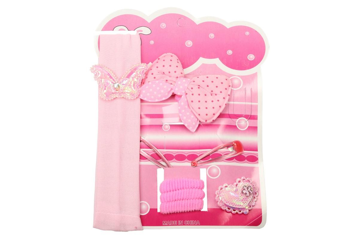 Čím udělat radost malé princezně? Kupte jí tuto sadu vlasových doplňků v růžové barvě! Tato sada obsahuje vše, co holčičky potřebují: 3 gumičky, 2 sponky, čelenku s motýlkem, 1 gumičku s třpitivým srdíčkem a gumičku s velko mašlí. Gumičky nemají žádné kovové spoje, tudíž dítě nebude nic tlačit. Malým parádnicím tak můžete vytvořit rozkošné účesy do školky nebo do školy.