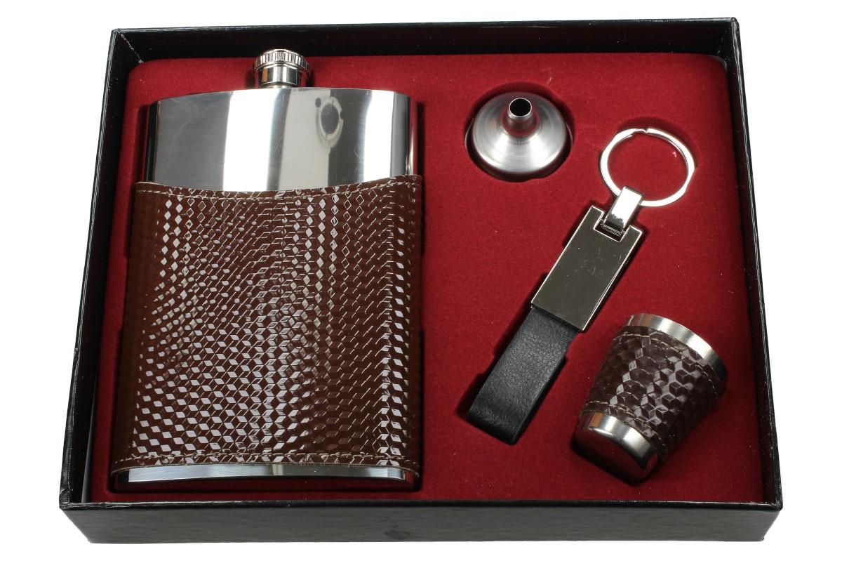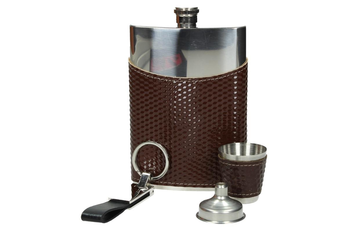 Originální dárek pro všechny muže, gantlemany a intelektuály. Placatka o objemu 200ml je vyrobená z kvalitní nerezové oceli Stainess steel, stejně jako nálevka a kalíšek. Placatka i kalíšek je navíc potažen tmavě hnědou koženkou, která imituje karbon. Touto krásnou sadou potěšíte každého muže. Ideální jako dárek, nebo na cesty vlakem, do přírody či na čekanou.
