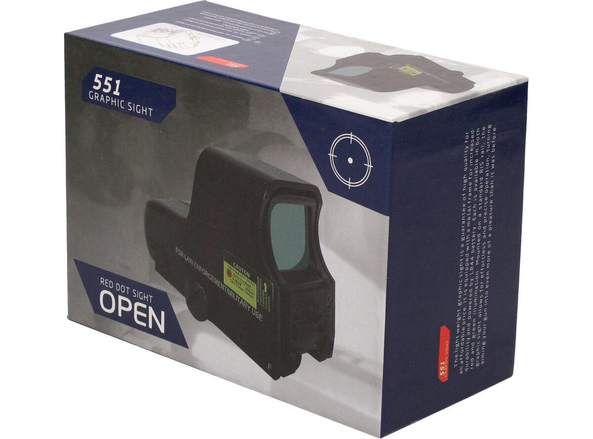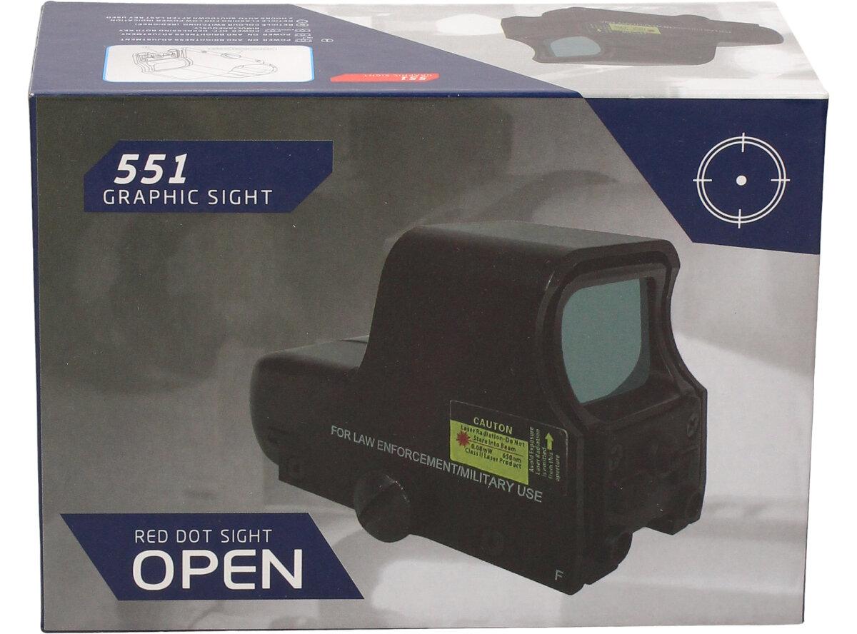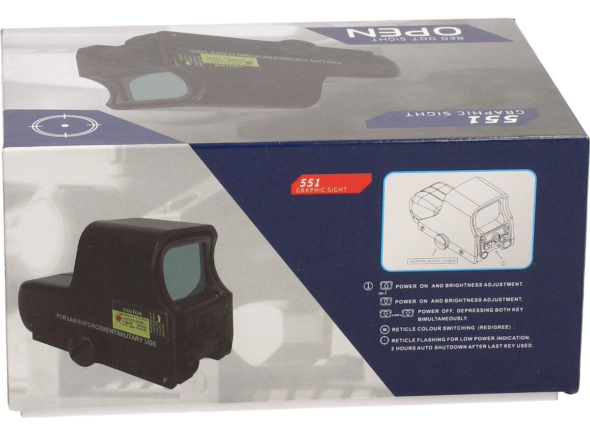 Holografický zaměřovač EOTech Tactical 551 Graphic Sight X-BOW 1x30. Elektronický Red Dot s integrovaným držákem pro 11mm nebo 19mm Weaver lištu. Boční a svislé nastavení, 3 body vzdálenosti. Intenzita světelných bodů je nastavitelná v několika krocích. Baterie jsou součástí balení. Holografický kolimátor HWS, je považován za jeden z nejlepších v míření, za pomocí otevření obou očí pro rychlou a přesnou střelbu. Má podsvícený světelný bod ve dvou barvách: červená a zelená (možnost regulace jasu). Samozřejmosti je vertikální a horizontální nastavení záměrného bodu a uchycení na RIS lištu 22mm. Poháněn je 4xLR44.