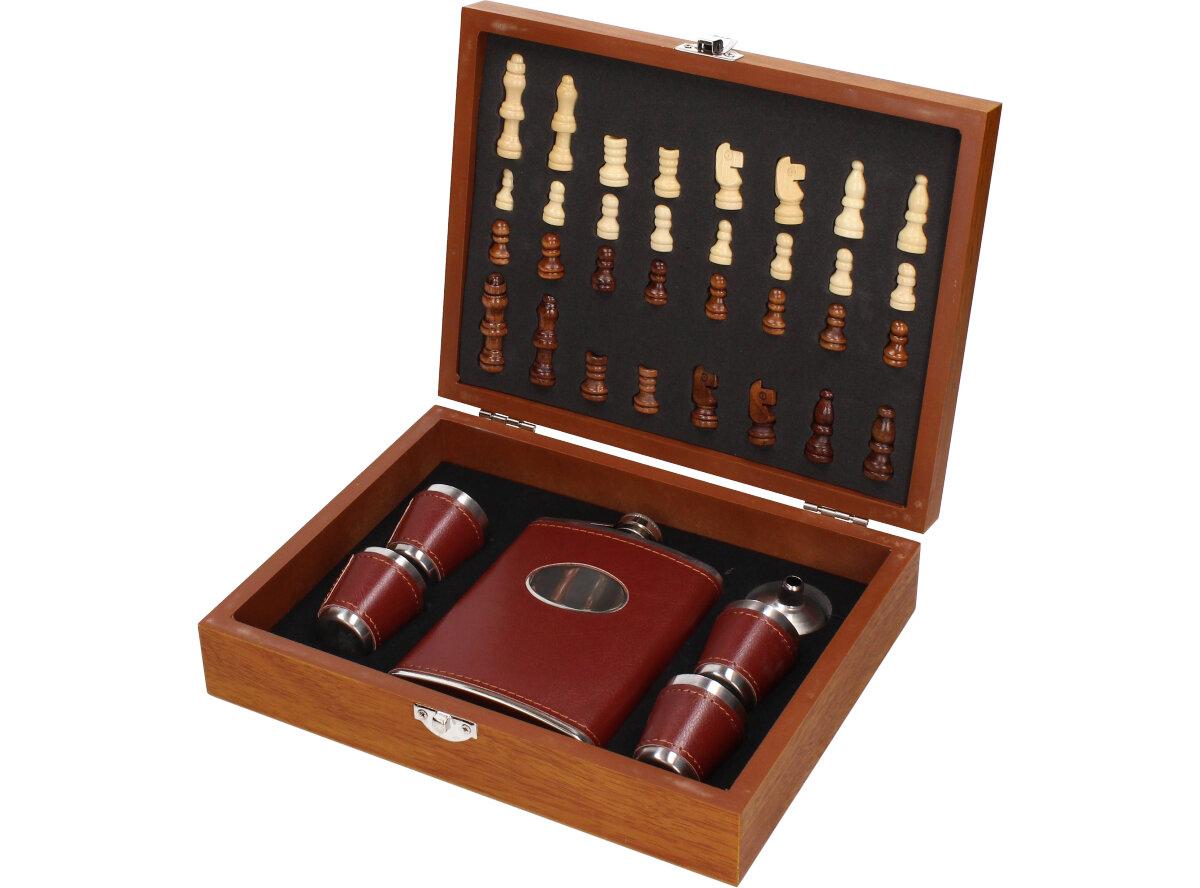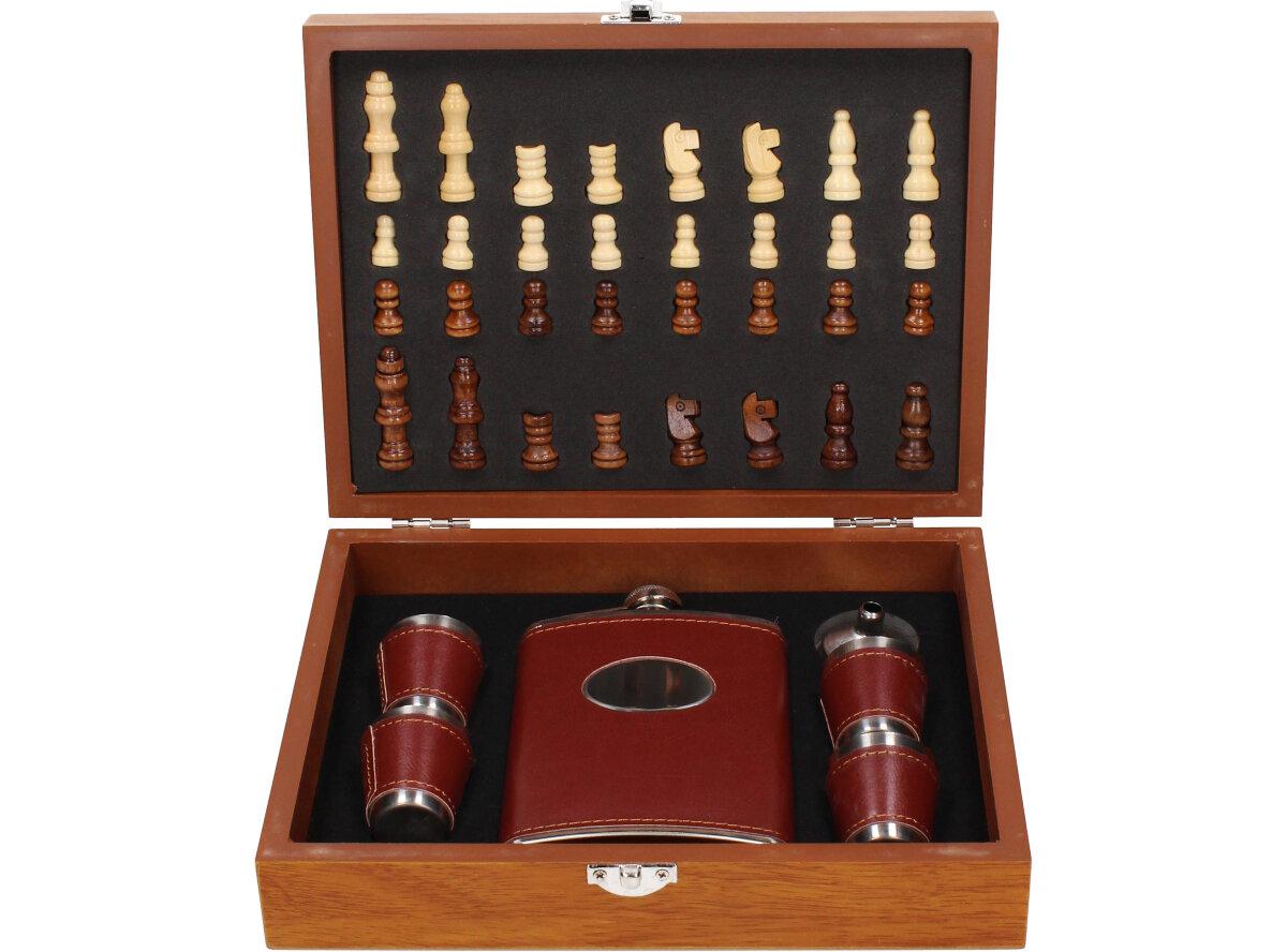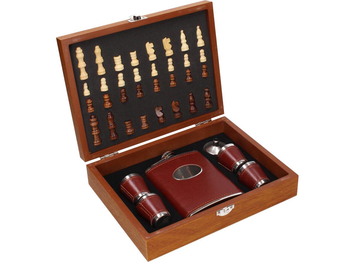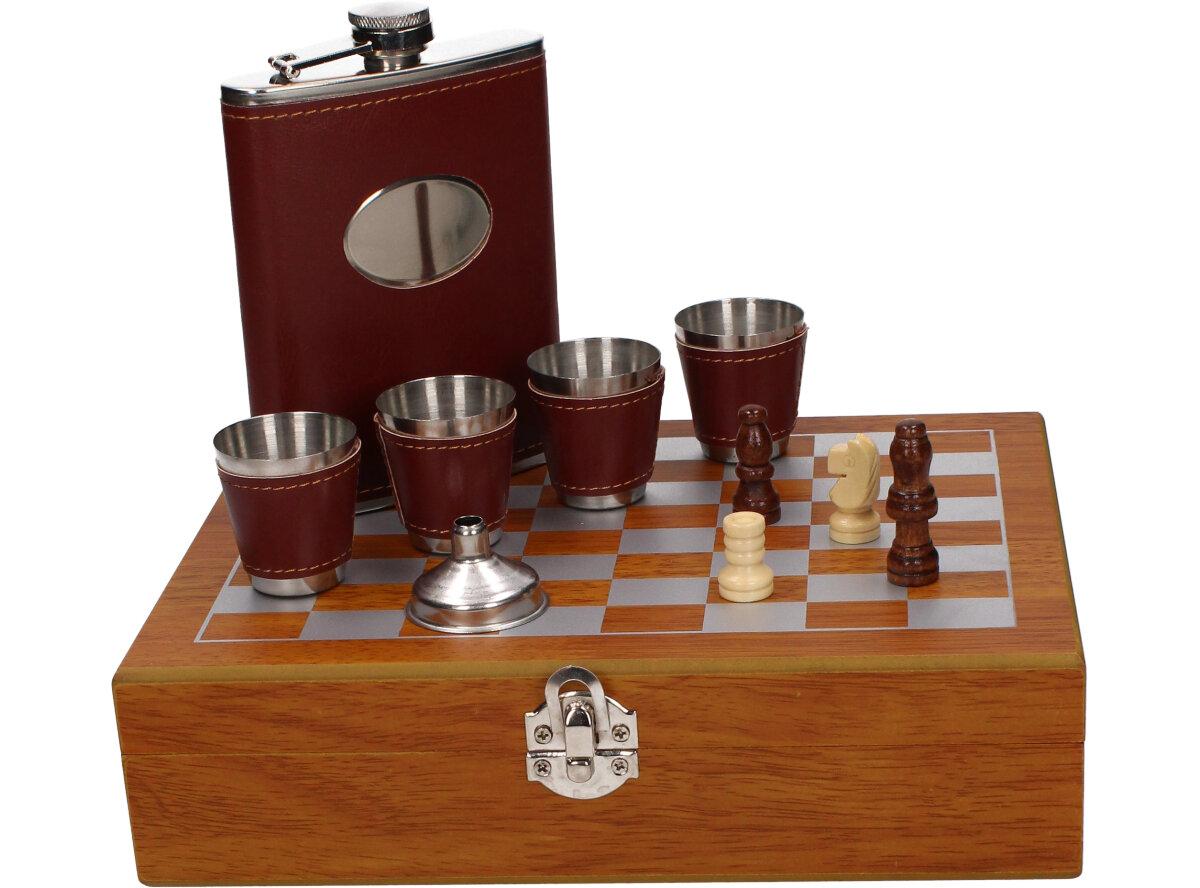 Dárková sada placatka šachovnice s panáky v kožence je nádherný a zajímavý dárek pro vaše blízké, rodinu i kamarády. Sada je vhodná i jako dárek pro milovníky a hráče šachových her. Sada obsahuje: placatku, 4 x panák, placatka, nálevka, šachy a hrací deska v provedení kufříku. Kufřík je dodáván v dřevěném provedení.