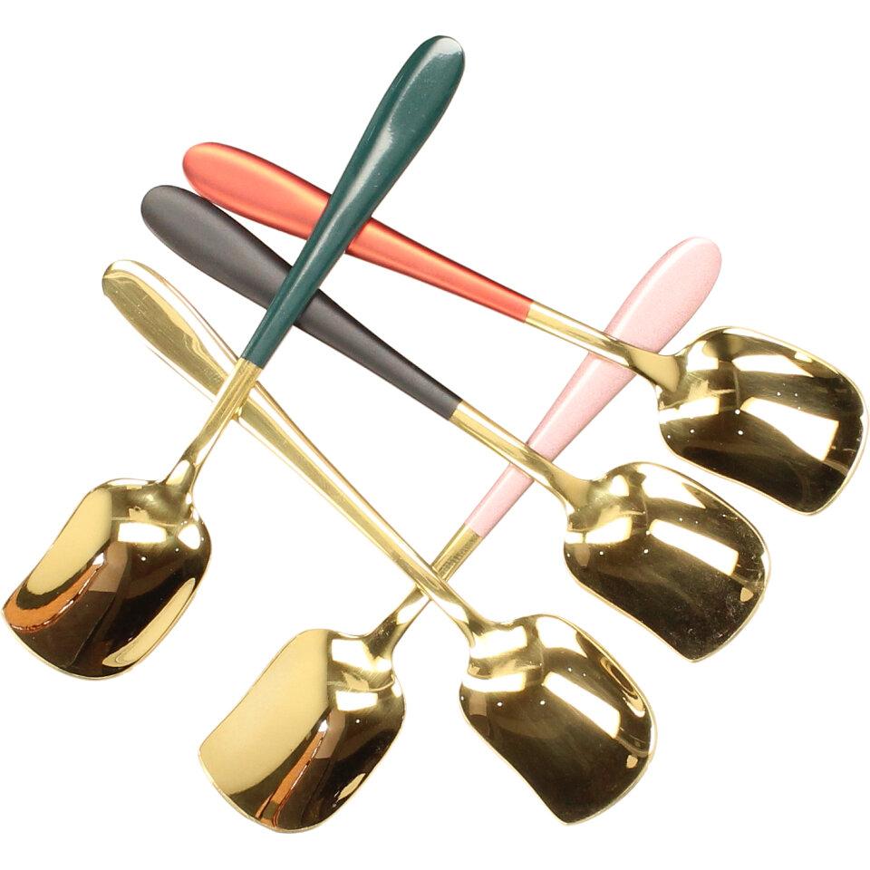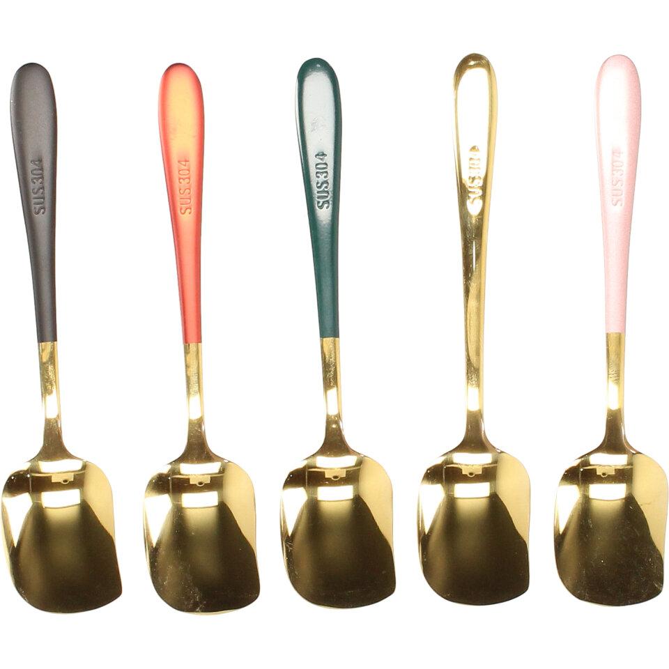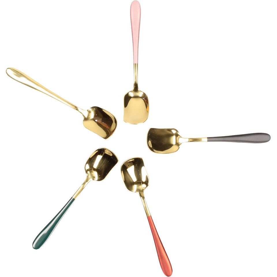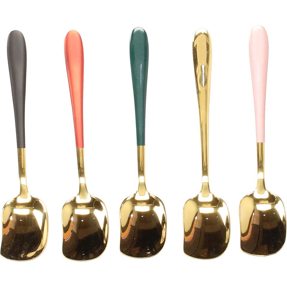 Stylové lžičky na zmrzlinu 5 kusů ve zlaté barvě s barevnou rukojetí. Speciálně tvarované lžičky jsou pěkným doplnkem do zmrzlinového poháru
