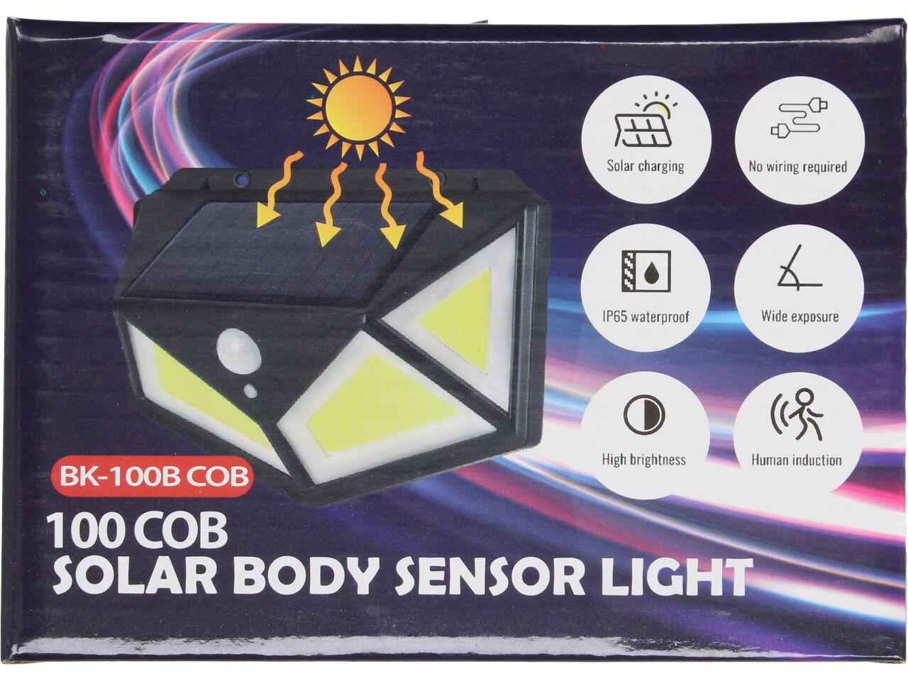 Solární interaktivní nástěnná lampa BK-100B COB se zapne na 15-20 sekund pouze při pohybu v oblasti senzoru. Doba provozu závisí na nabití baterie a četnosti zapínání.