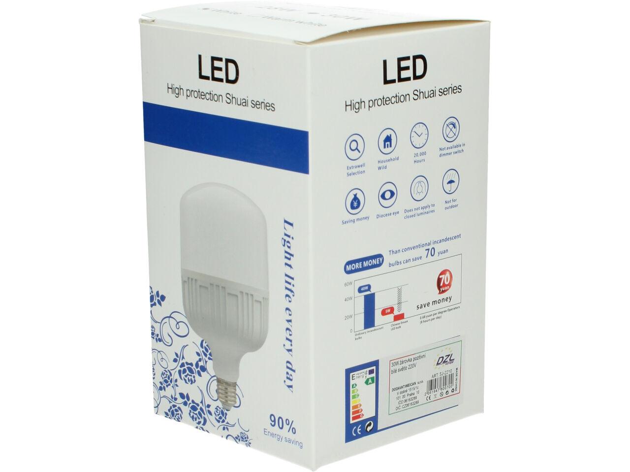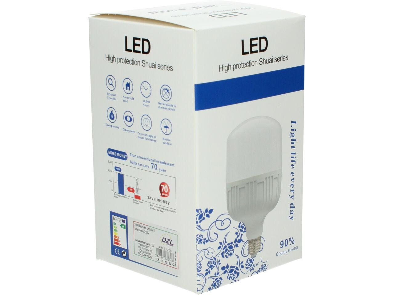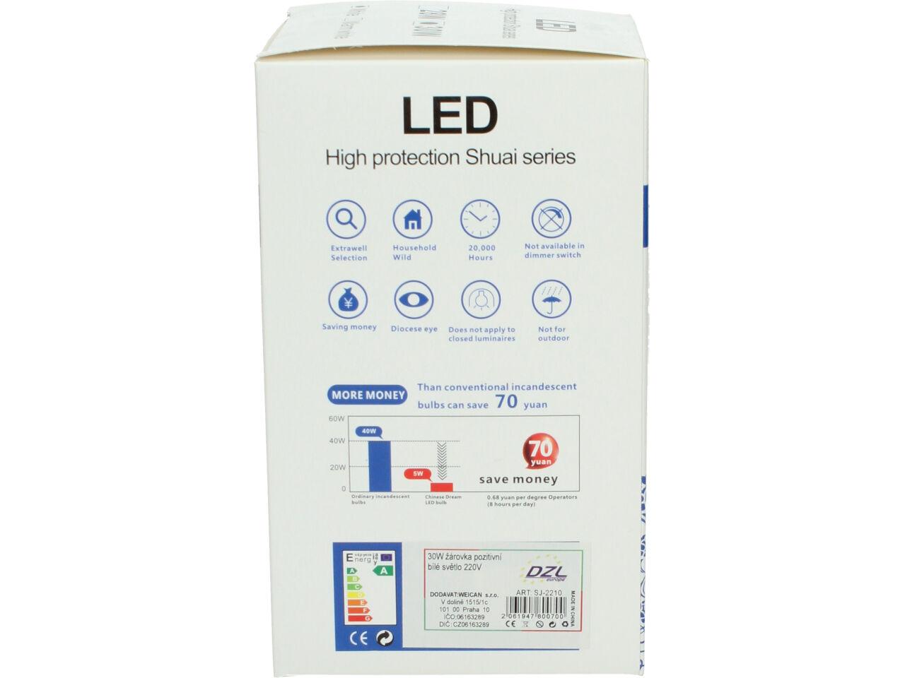 Úsporná žárovka 30W klasik je kvalitní náhrada za 150W žárovku. Žárovka je v plastovém pouzdře, které umožňue dobré chlazení LED diod. Životnost žárovky se odhaduje + 20 000 hodin. Žárovka je určena na napětí 220V. LED úsporná žárovka 30W klasik klasického tvaru s nejpoužívanějším závitem E27, které svítí bílým světlem (tzv. bílá studená). Rozměry činí 90x90x150 mm.