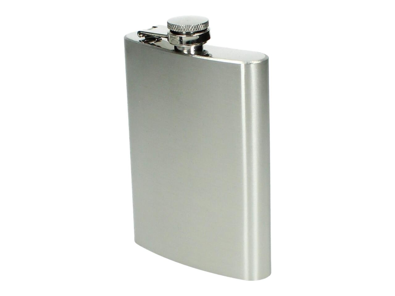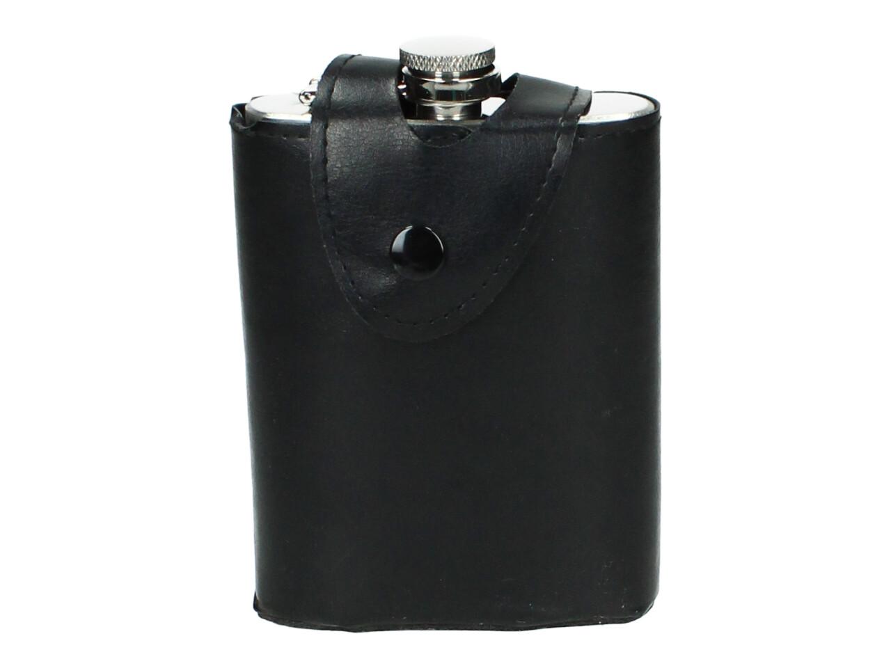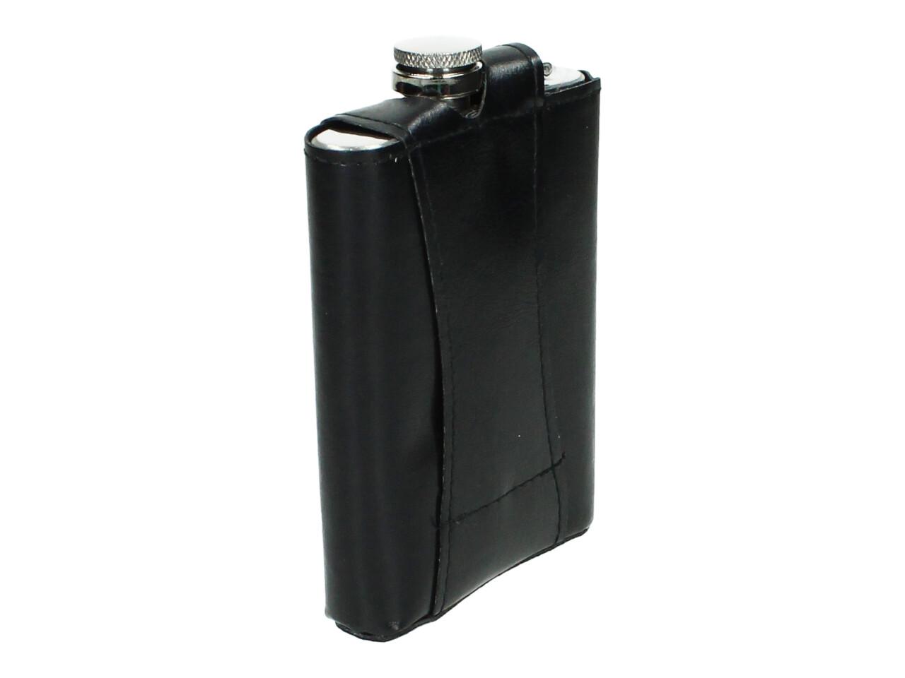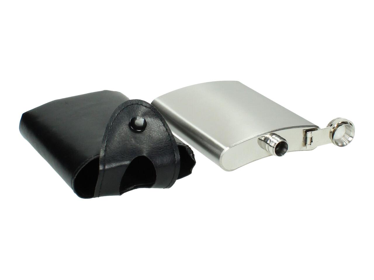 Plastka na cesty na alkohol z nerezu a bez vzoru dodávána s pouzdrem z umělé kůže s možností připevněním na opasek. Placatka nerez bez pruhů 235 ml (8oz) na alkohol nebo jiný nápoj. Ideální do náprsní kapsy Rozměry 13x9 cm s uzavíratelným víčkem o objemu 2,66 ml