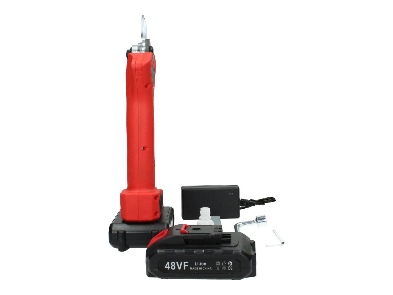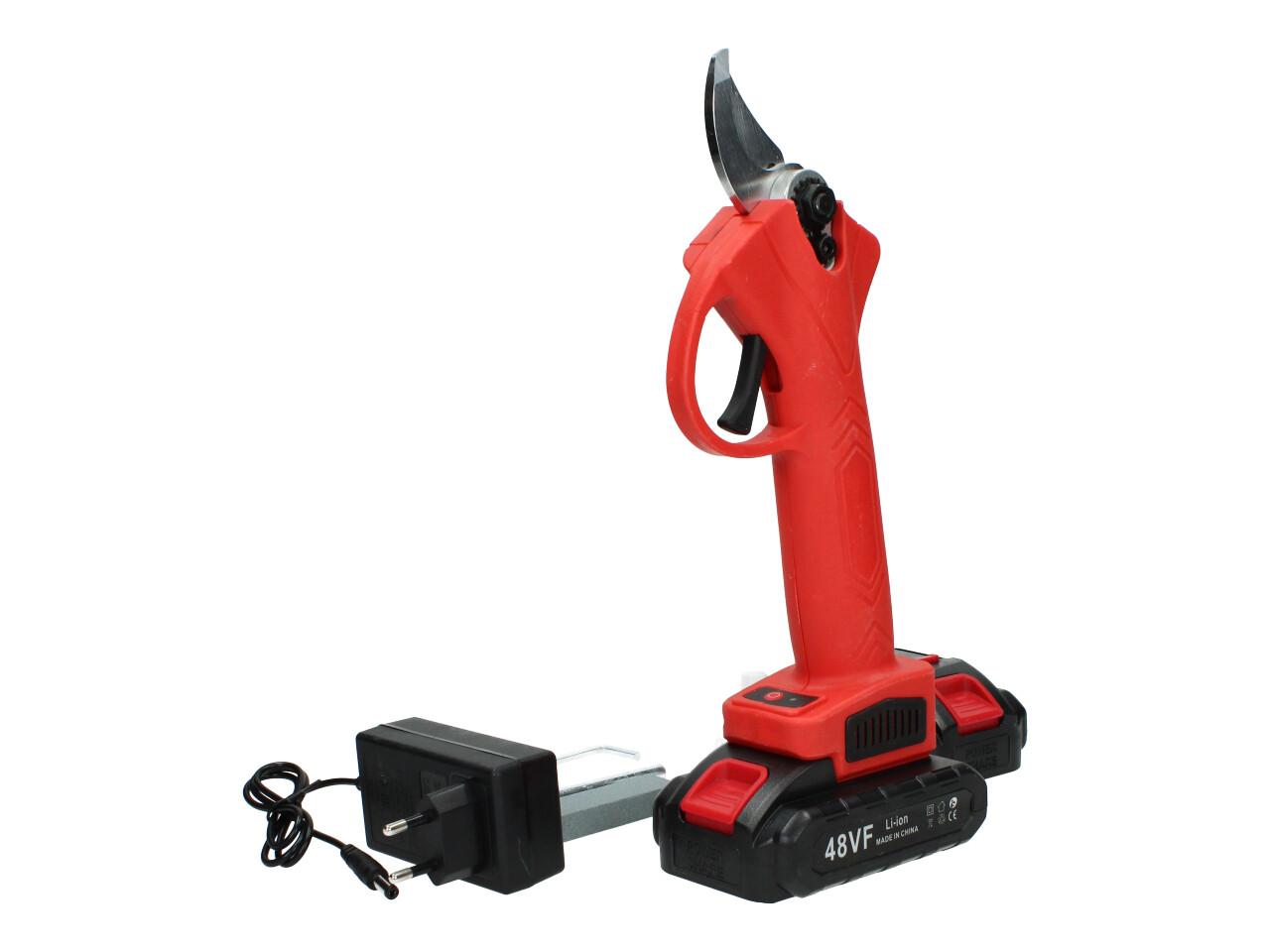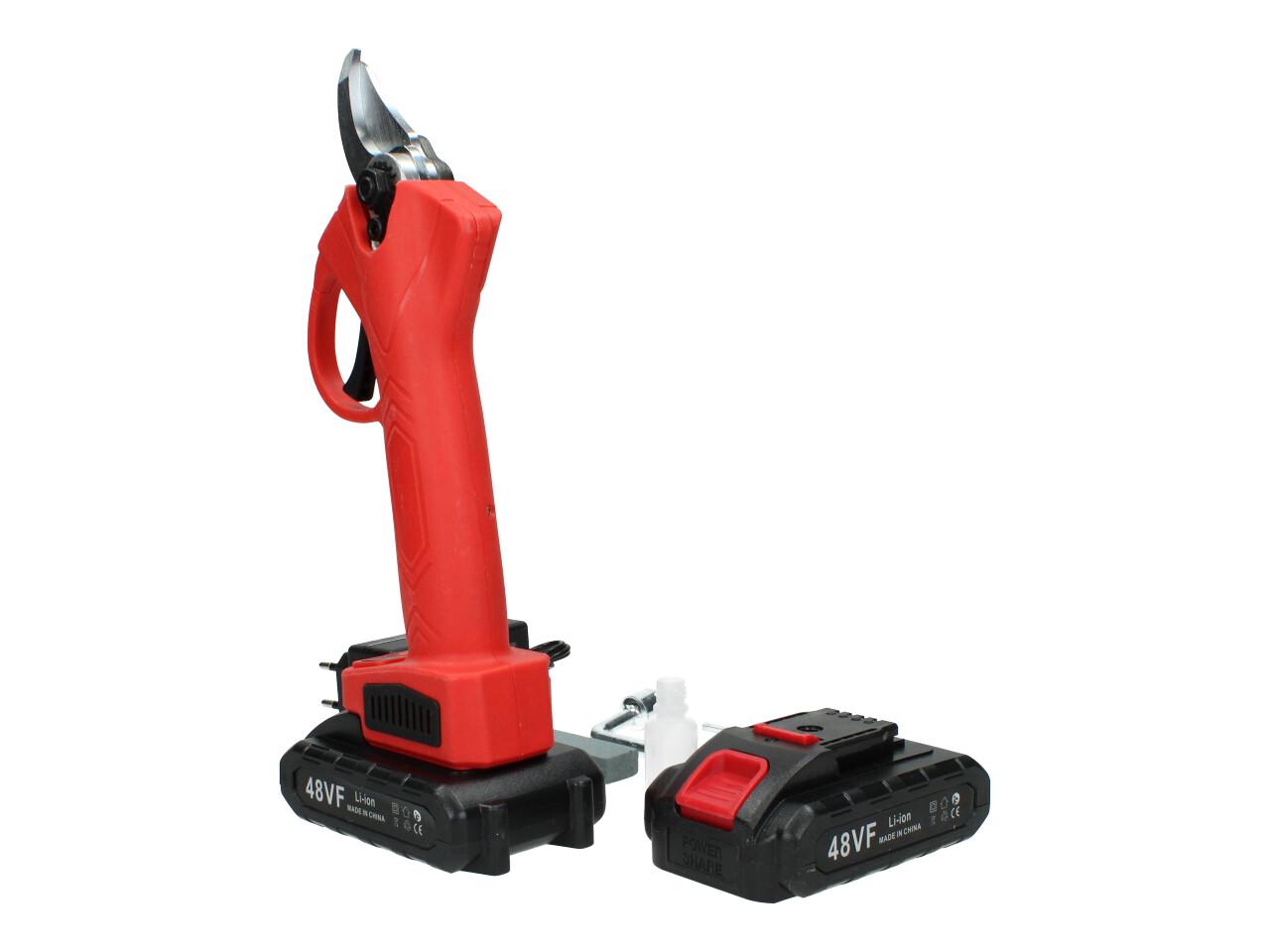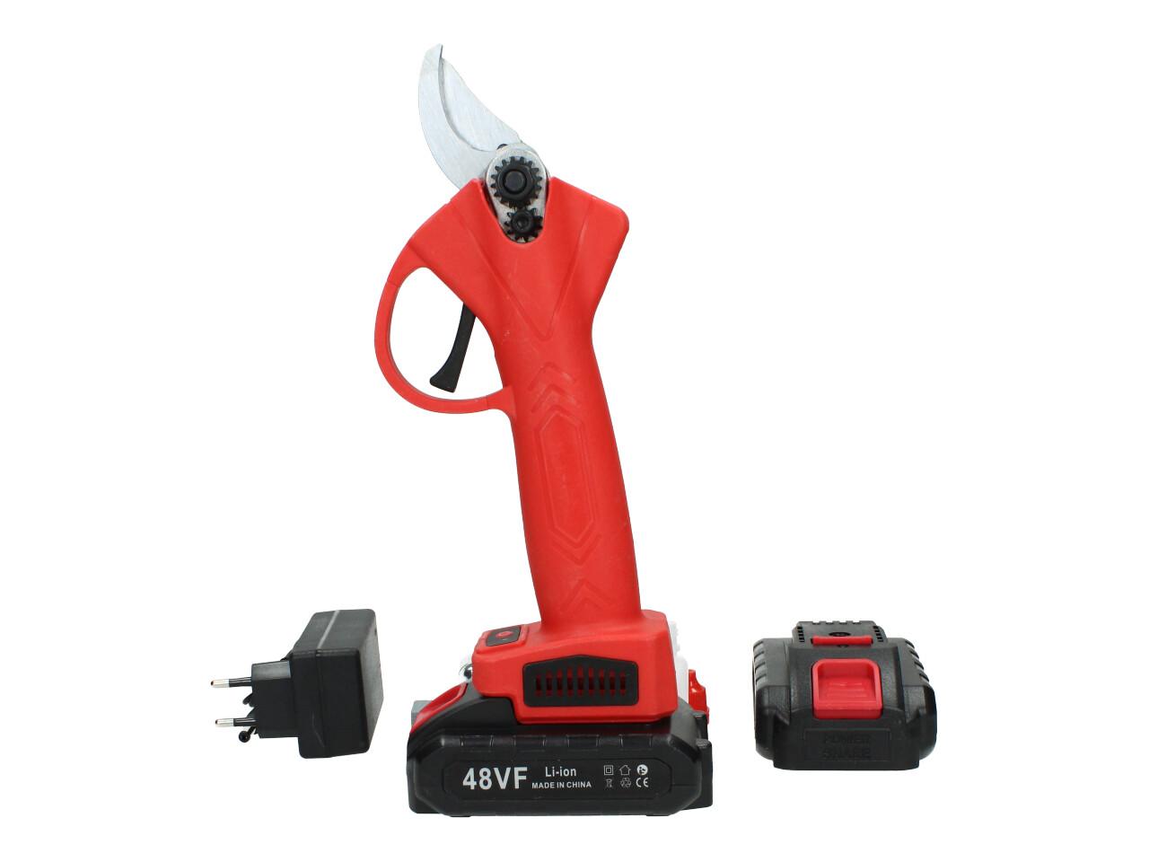 V sadě naleznete aku nůžky na stříhání větví, dva nabíjecí akumulátory 48VF včetně nabíječky, kufřík a příslušenství. Nůžky jsou vhodné pro štípání větví do průměru 25mm, se sílou 100Nm, otáčkami 135 rpm, maximální otevření nůžek je 42mm s napetím baterií 48V a kapacitou 2,5Ah