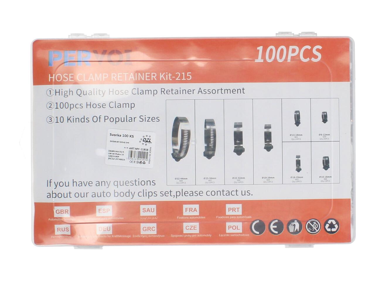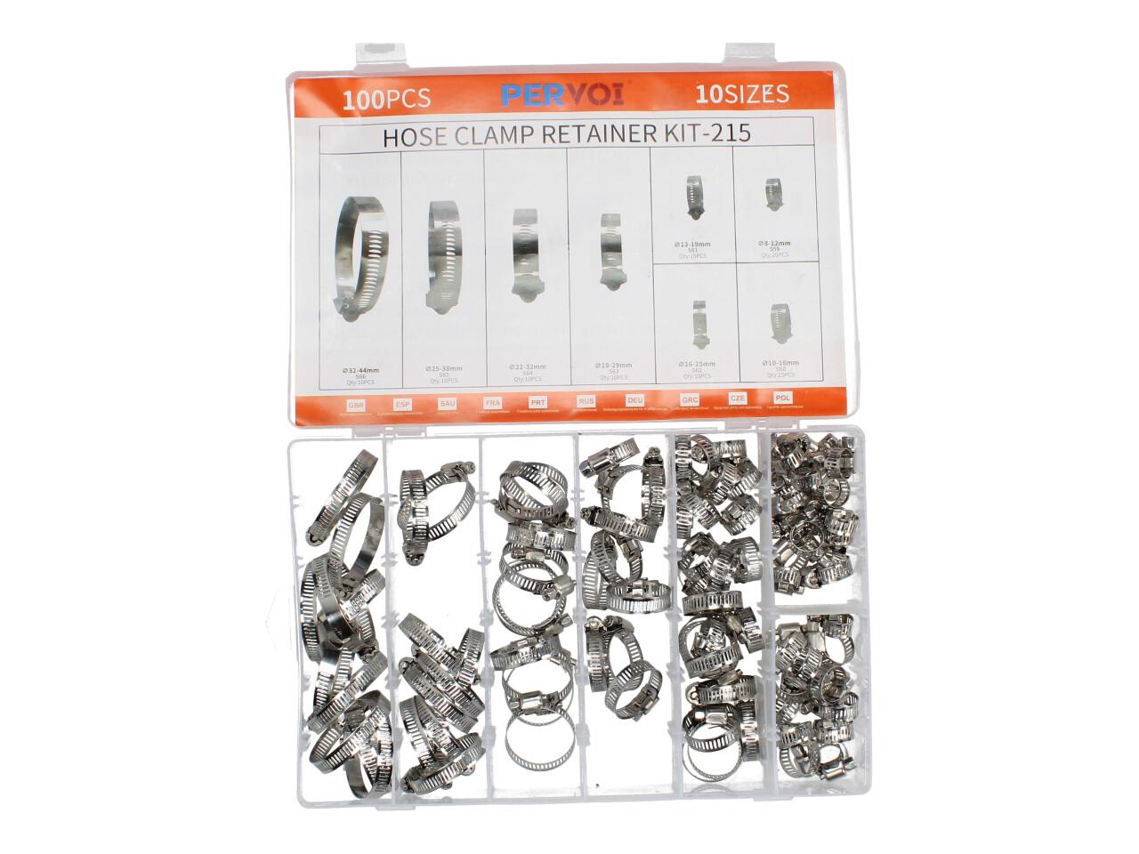 Sada obsahuje 100 kusů kovových utahovaích spon na hadice od rozměru 44mm do 8mm 8 velikostí.